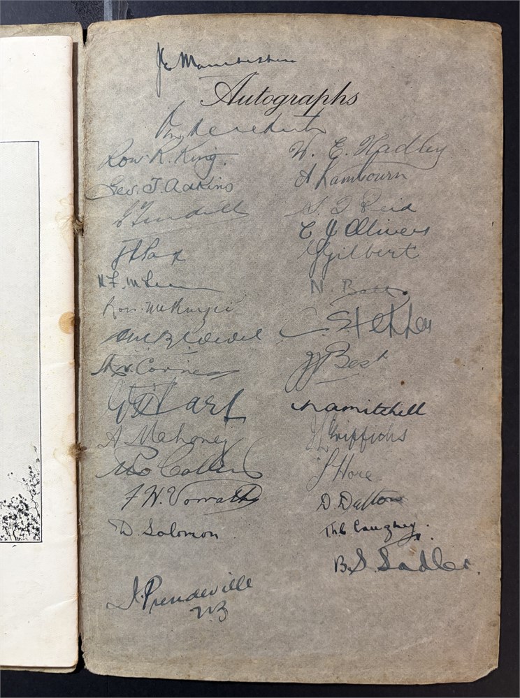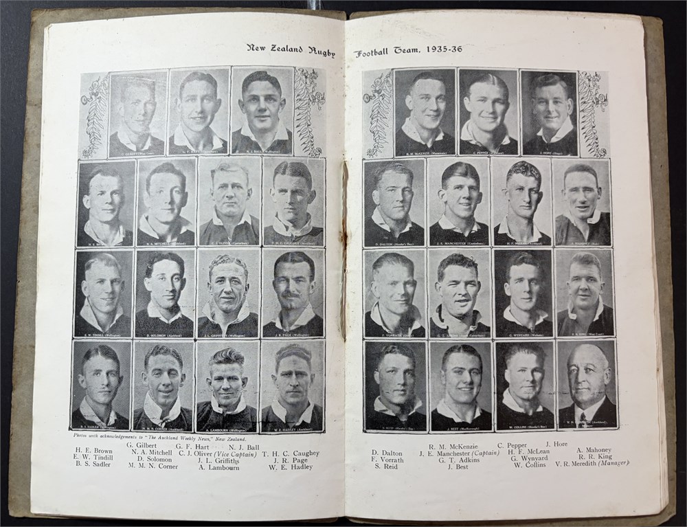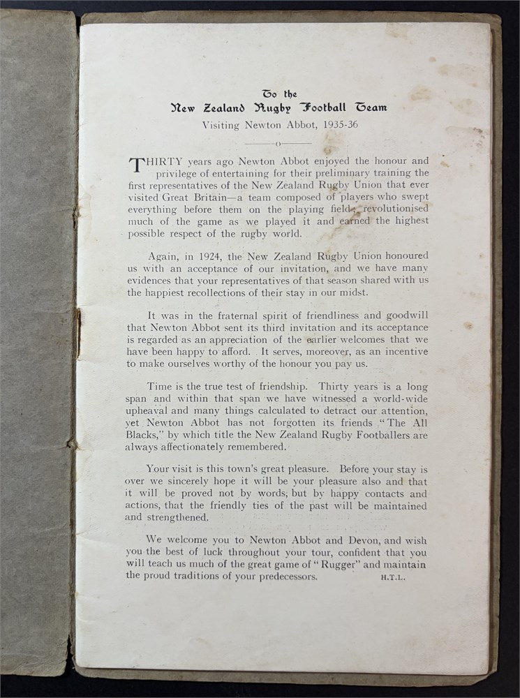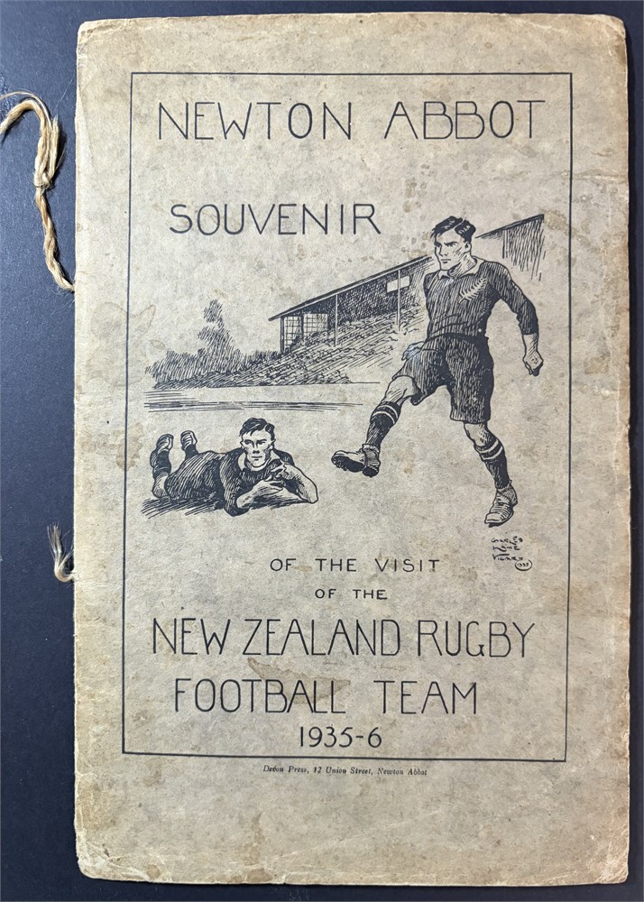 Newton Abbott Souvenir of the visit of the New Zealand Rugby Football Team 1935-36. 32 un-numbered pages, fixtures listed. Signed inside back cover by All Blacks 30 signatures. In Good Condition.
