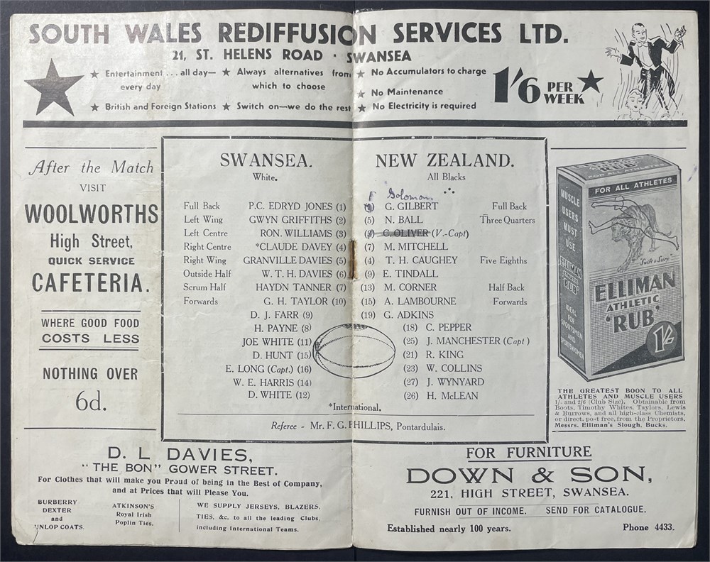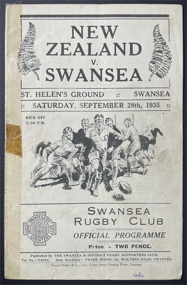 Sat Sept 28th, 1935. St Helen's Ground, Swansea. Tape to spine, single crease, small tear to cover Change noted on team sheet. Cover soiled.