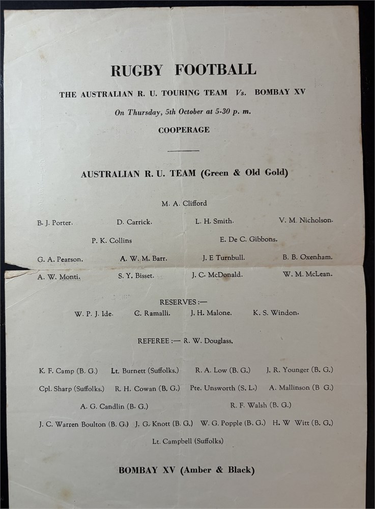 Impossibly rare programme. The Australian RU Touring team vs. Bombay XV. Bombay Gymkhana Rugby Football Club Thursday 5th October 1939. In Good condition. Single folded page. Unofficial match organised on way home for the 1939/40 wallabies who left the UK when war was declared and played no match.