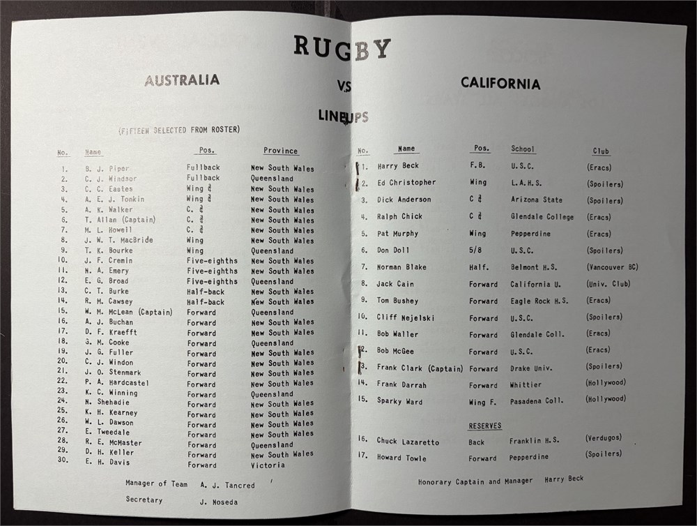 March 14, 1948. Los Angeles Coliseum. Excellent condition. Team was actually 'Southern California'. Australia won 37-0.