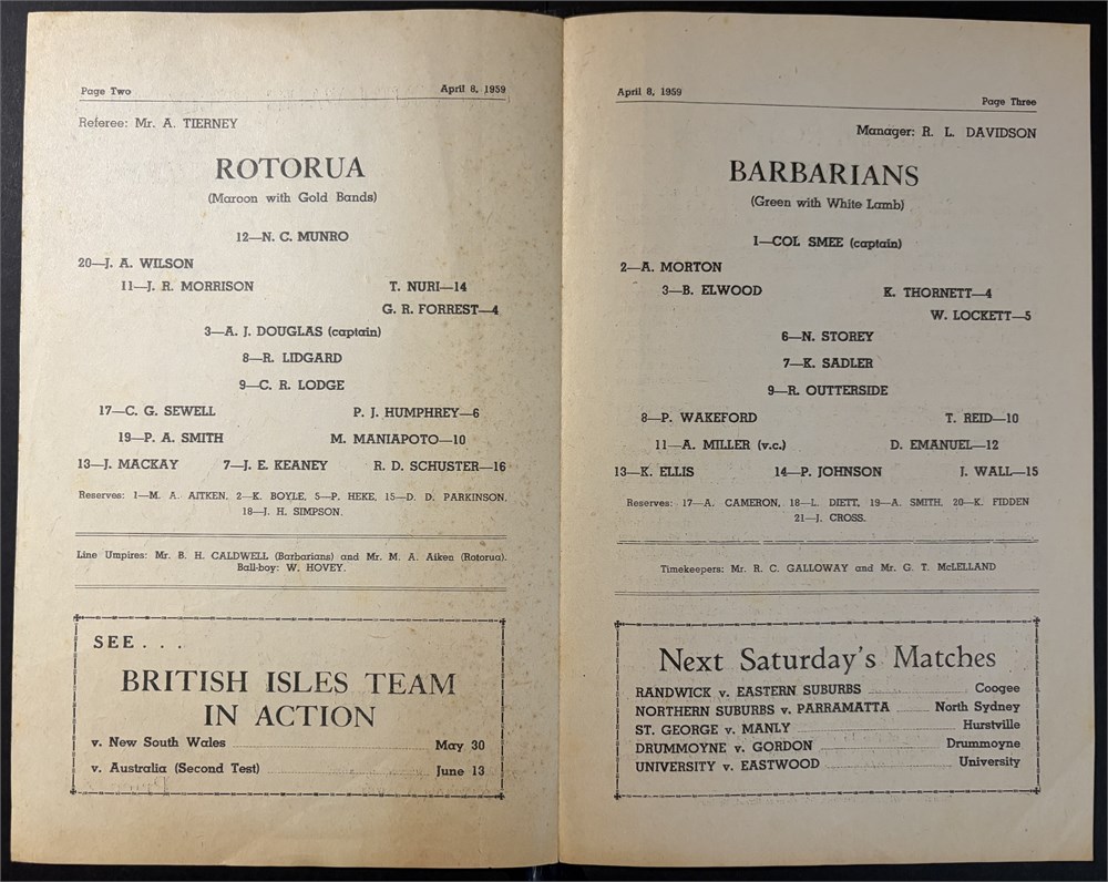 April 8 1959, Chatswood Oval. Singl page with single fold. VG.